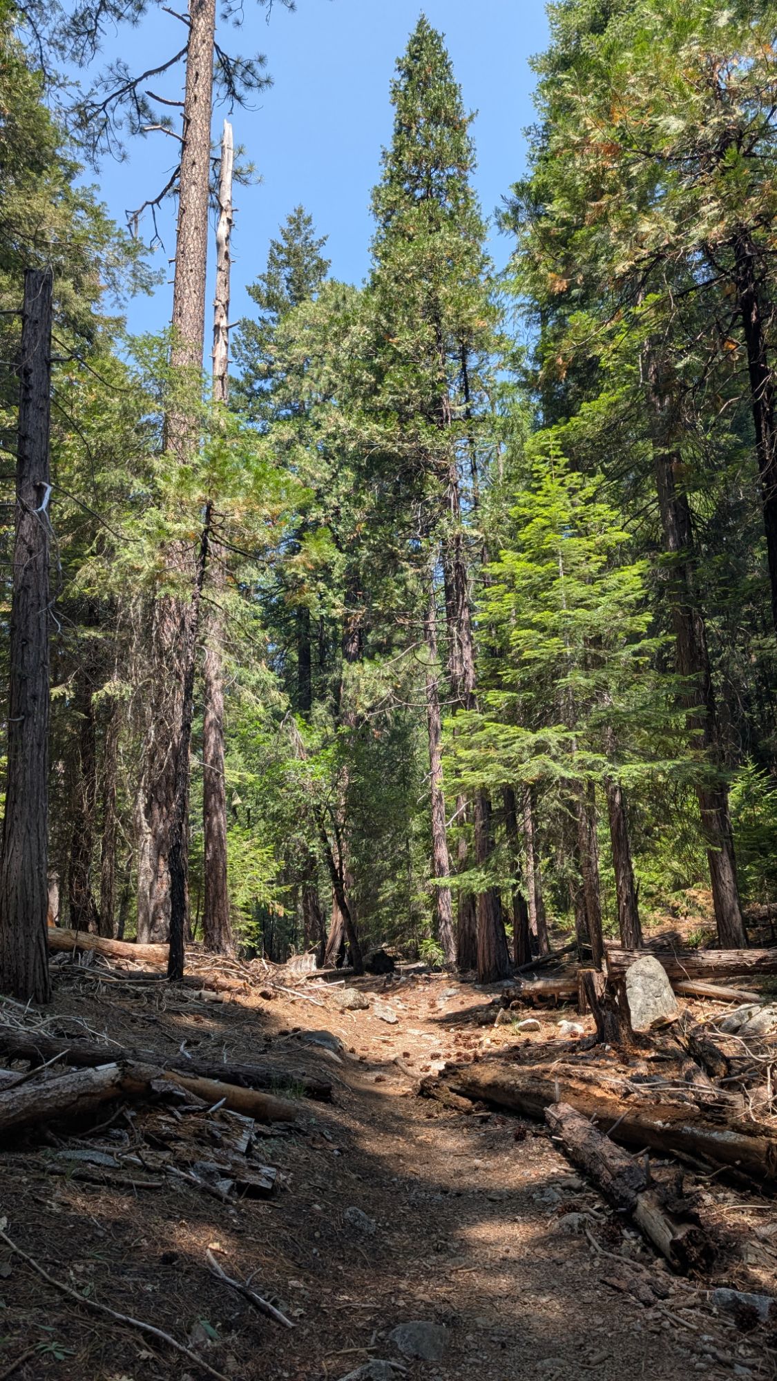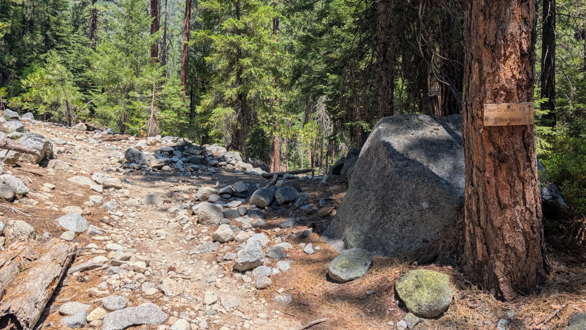 Only 15 minutes later I reach the junction with the Deer Creek Trail. The forest canopy is sparse enough that the hot sun beats down on my shoulders. It’s another half mile to Morris Meadows as I pass a squirrel’s lunch stump.