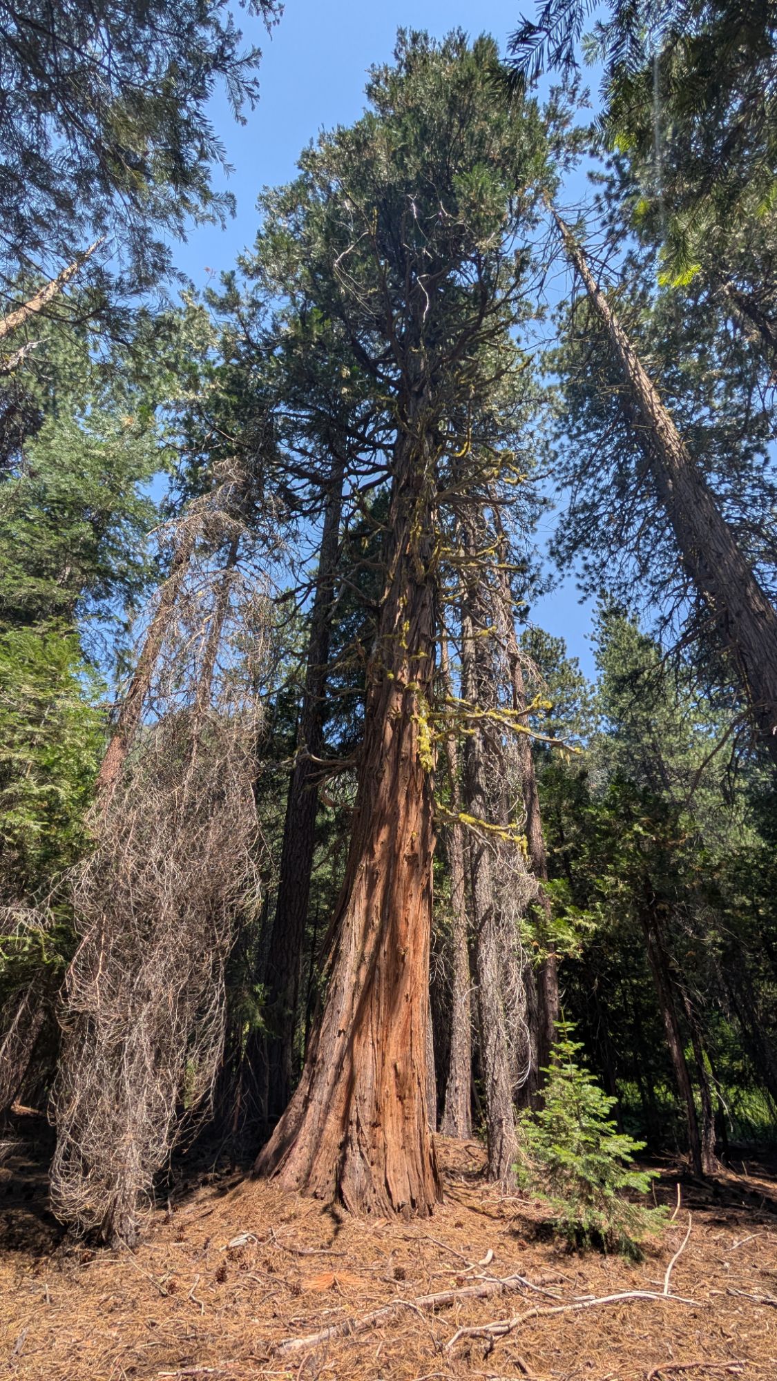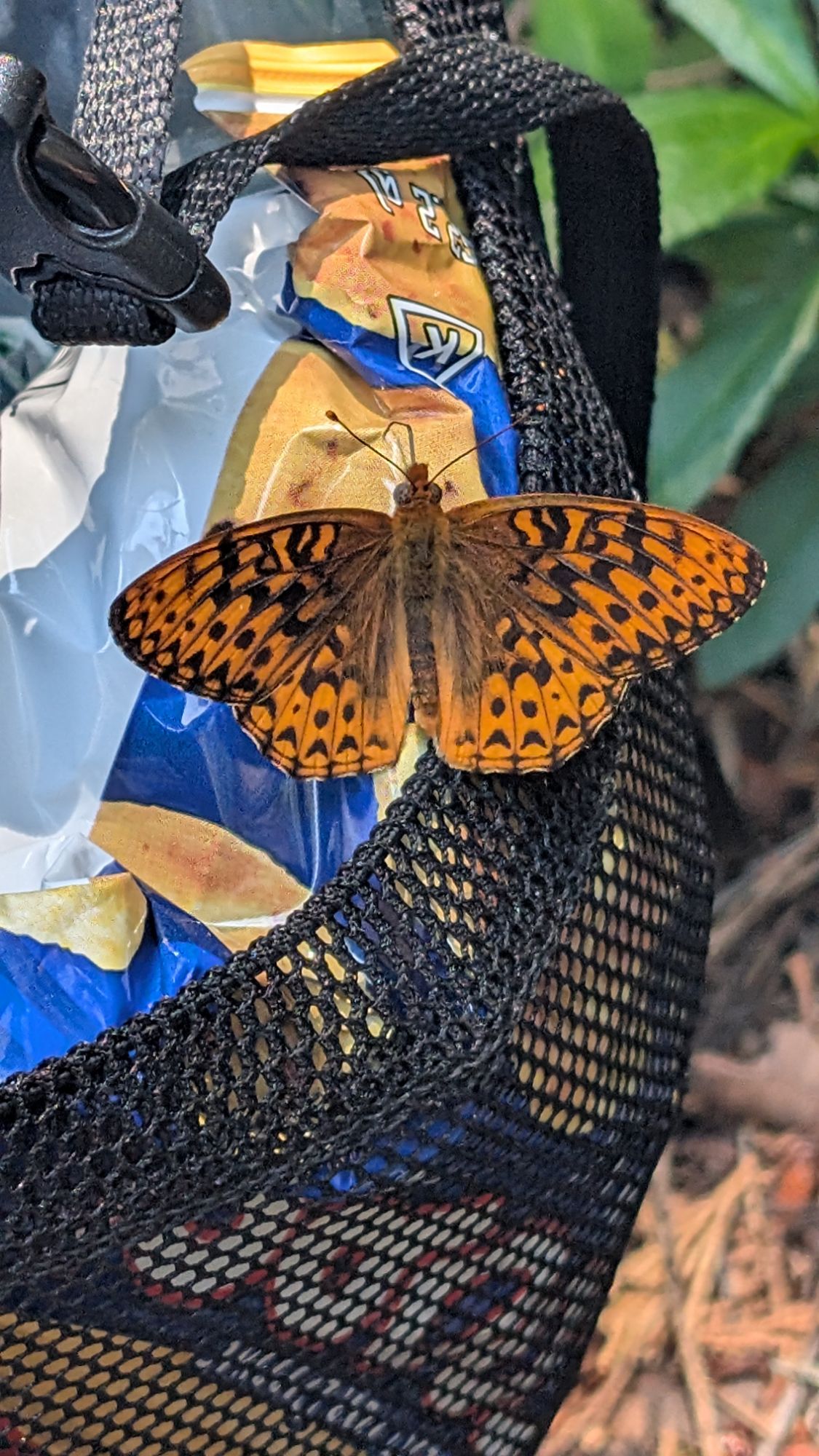 Sugar pine, ponderosa pine, incense cedar are warming with the day and their sweet smells fill the forest all around me. Candle companies try to make candles that smell like this but of course they can’t get it right. Not long after 1 pm the map shows a nearby spring and I can hear it flowing. I stop and suck down the rest of my electrolyte water before kneeling to collect ice cold water. I take a break on a rock as a Fritillary lands on my backpack. It’s proboscis probes my fritos chip bag, probably finding delectable bits of salt. I sit and watch it for a long time. I’m in some kind of butterfly vortex as Fritillary, California sister, Swallowtail and a red underwing all circle around. I refill my other water bottle with more cool spring water before hoisting my pack again. My Fritillary friend rides with me for a tenth of a mile before flitting on its way.