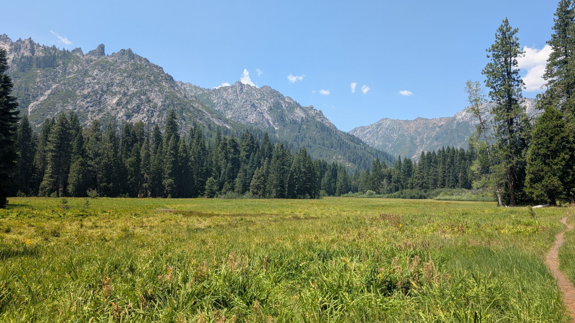 The trail leads into the open Morris Meadows with granite peaks lining its edge. Stuart Fork is on the far side of the meadow which makes things a lot quieter.