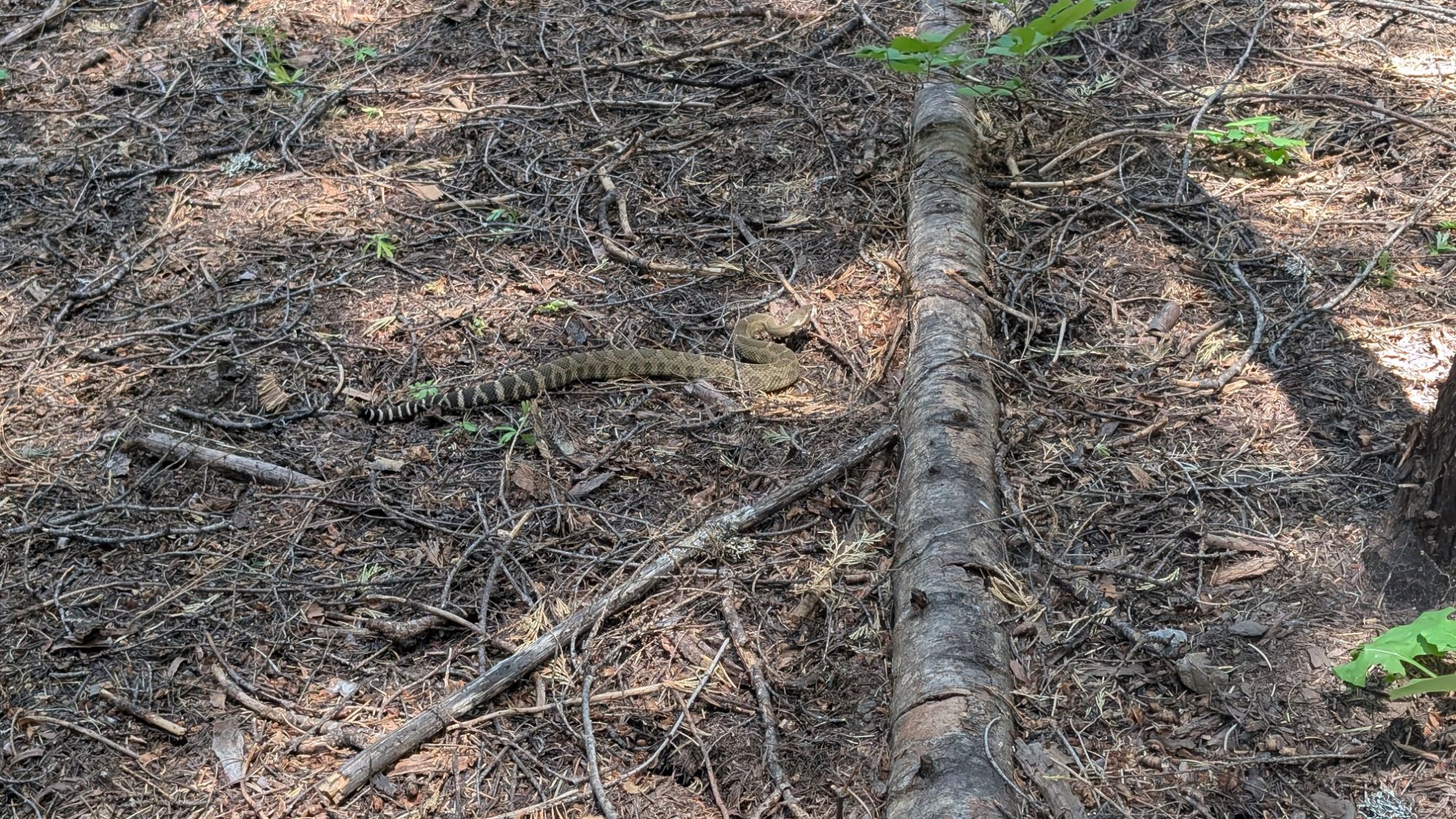 The path winds back into the trees. My attention is not on the trail when a short rattle causes my head to snap back forward. I stop in my tracks as the rattlesnake sits quietly on the trail. It’s tail is like black and white stripes that morph into classic green rattlesnake print. I take several steps backwards and it starts to move off the trail. I take a couple steps forward and it coils its head into an offensive position. I take a few steps back again and watch it slither off. Once I feel it’s safe, I pass by quickly on the trail. My mind can’t help but imagine the snake rushing at me. Dearest people, this is why you don’t wear headphones while you hike!!
