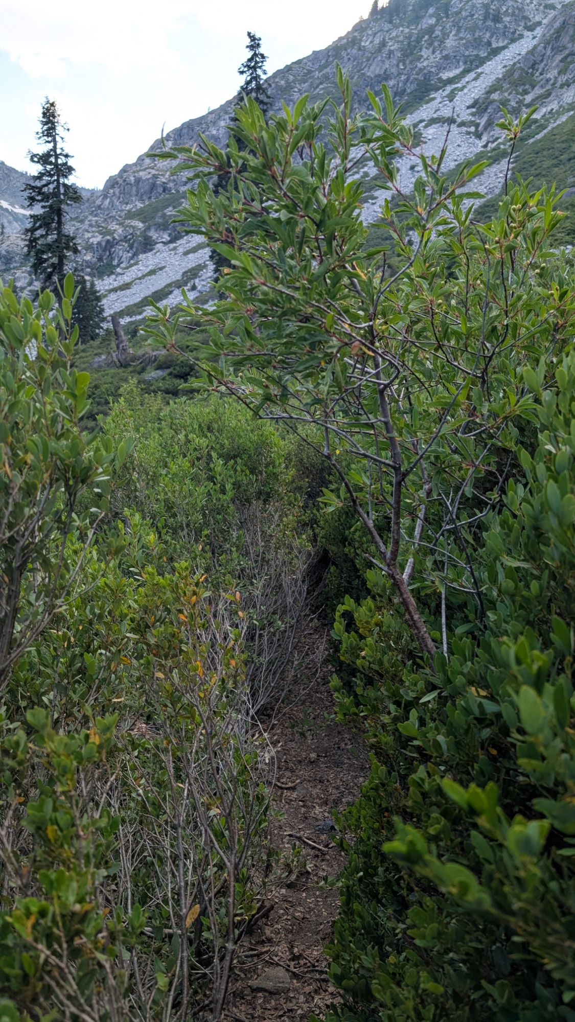 I decide to hike on around the lake since I’m still contemplating going to Sapphire Lake. I push through some brush which opens up into a few forested camping spots that sit above the lake. I follow the trail and then hit more brush. I squeeze myself through, all while my legs and arms are exfoliated. I’m sure that the gossamer gear pad I have strapped on the bottom of my pack is getting shredded. There has been some trail work but wow, it’s just not enough.