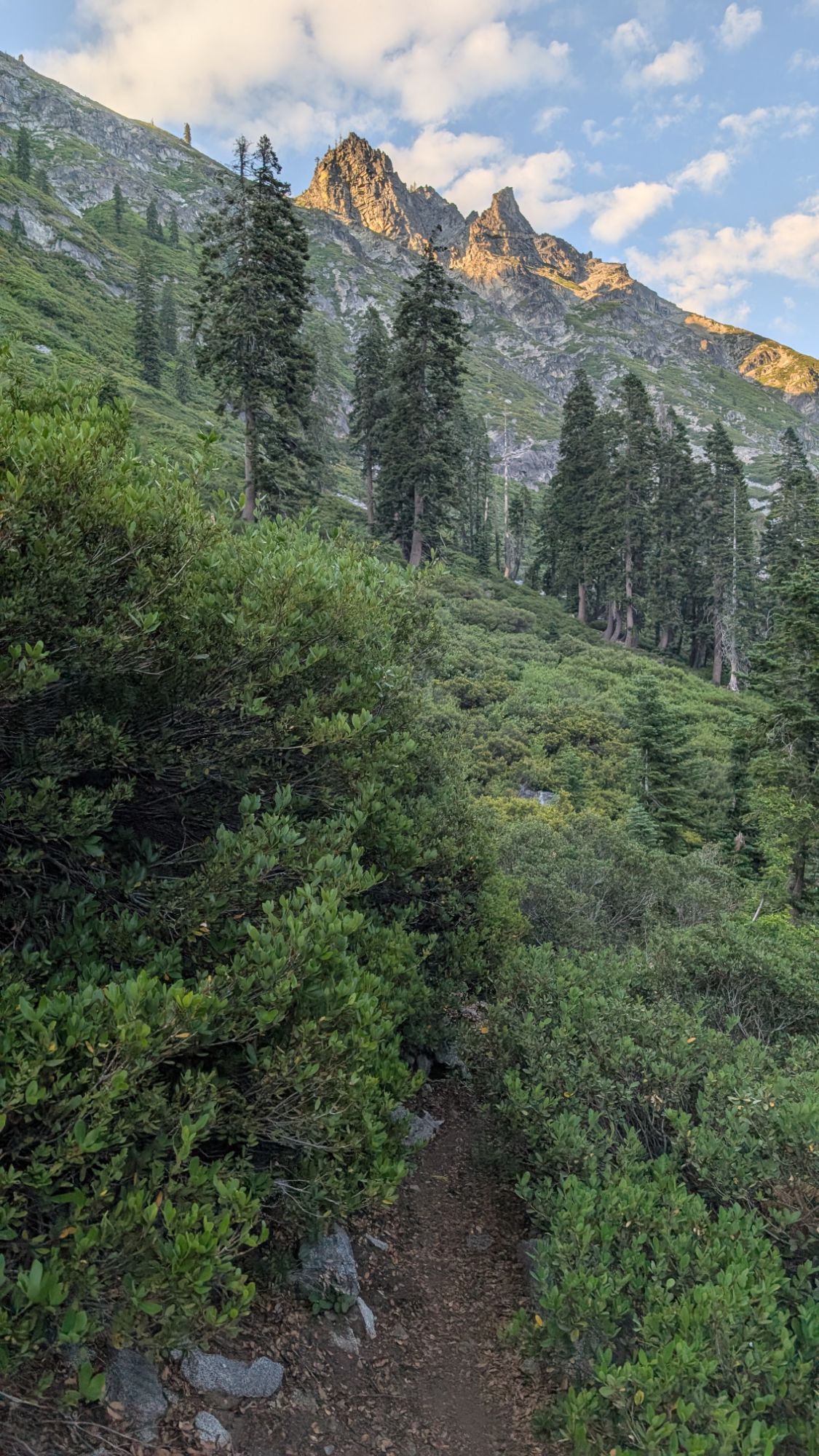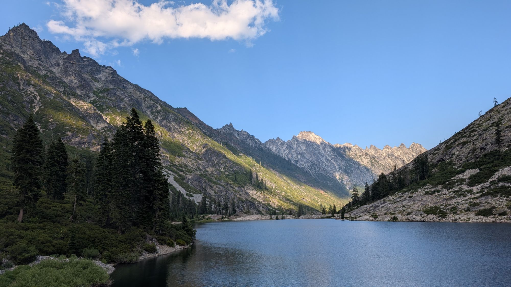 I emerge into the rocks and follow the trail a short ways before the obvious scramble begins. I look back at Emerald Lake and down the Stuart Fork valley. It’s about 6 pm and I start to do some math. What if I go up to Sapphire and there’s no camping and I have to come back down here? What if I do camp at Sapphire and then have to trudge through all this brush in the morning? I do some math and know that I won’t have enough time tomorrow to complete the necessary miles if I’m slowed by all this brush and rock scramble. I reluctantly turn around, push back through the brush and stop at one of the nice campsites I had seen. I keep thinking about doing the Caribou Scramble in the morning but know that I won’t have enough time for that either. I will have save that for another trip.