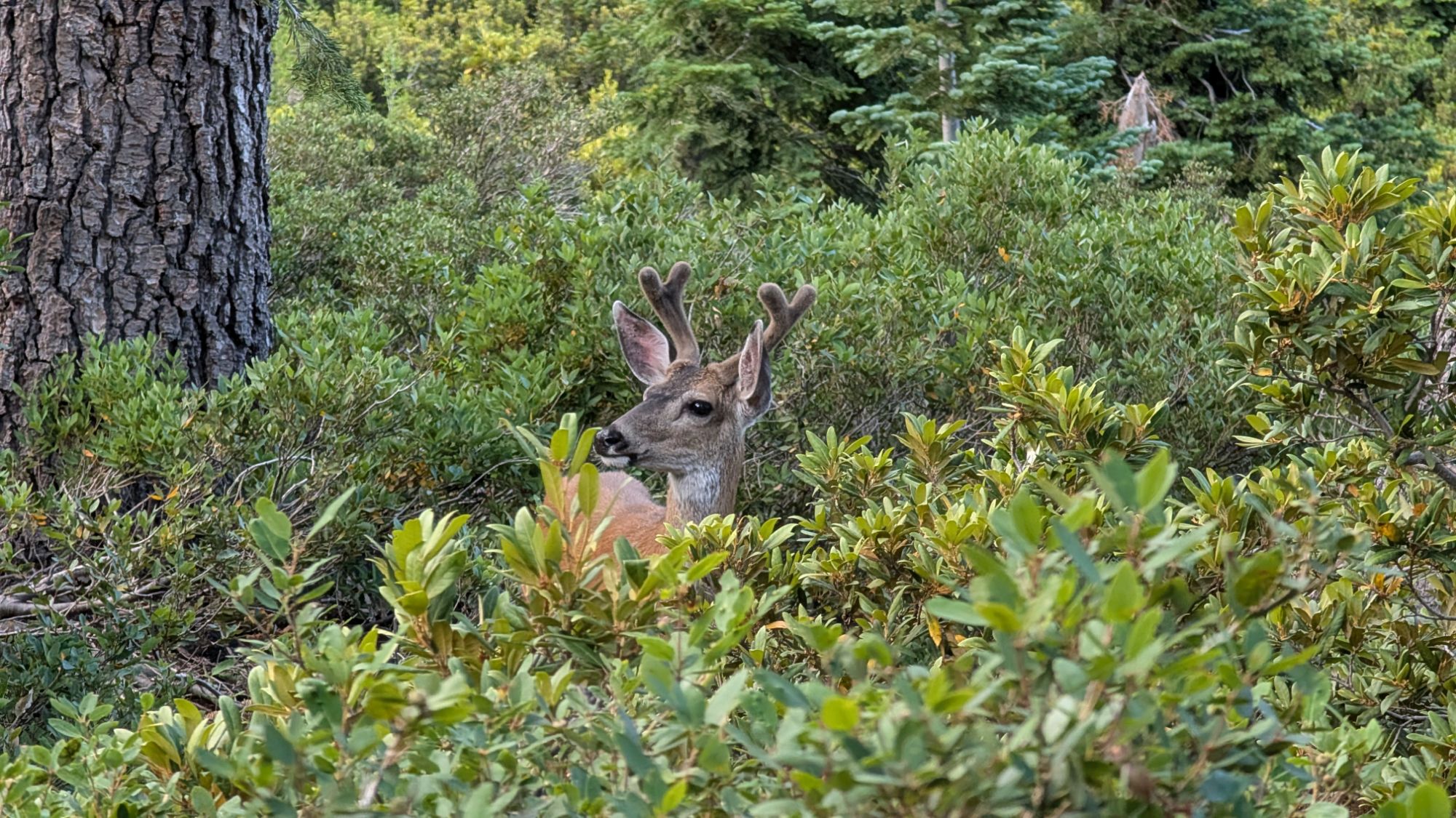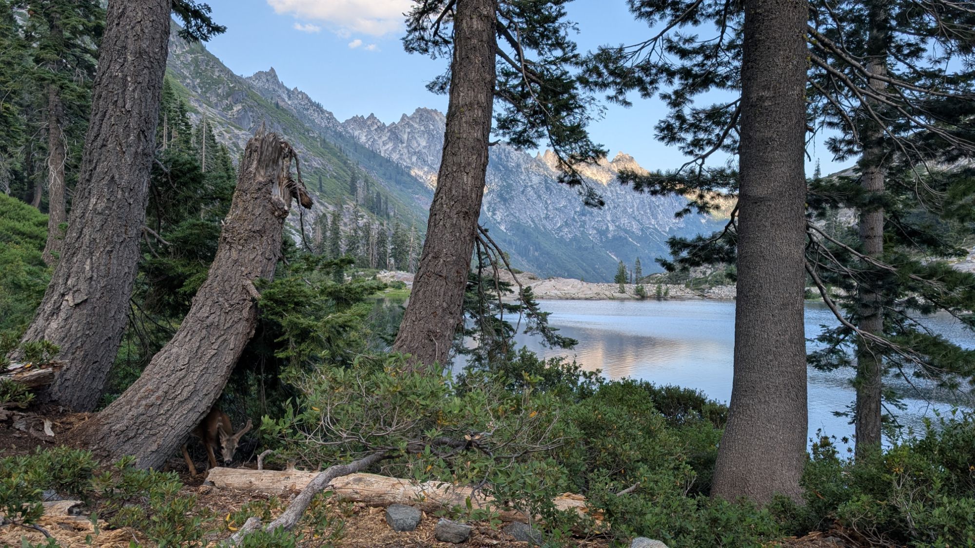 By 6:30 pm and I have my gear unloaded and my tent set up. This site has a perfect granite table on which to set all my stuff. And just below my tent is the ultimate granite seat for dinner. I sit down to eat and there’s immediately something very loud crunching around in the brush. I can’t see what it is but it sounds giant. Convinced that it’s a bear, I run and grab my bear canister and stuff my food into it. The crunching moves around my right side towards the lake. I grab my trekking poles and make loud noises. Things go quiet and I start to eat my dinner again. Now, the noise is directly in front of me and I’m sure that a bear will emerge. To my relief, a buck with forked velvet antlers pops out of the brush. I make some noise to scare it off but it is undeterred, and slowly wanders around the edge of my camp looking on with interest. He eventually leaves but returns shortly with his girlfriend who is equally unafraid.