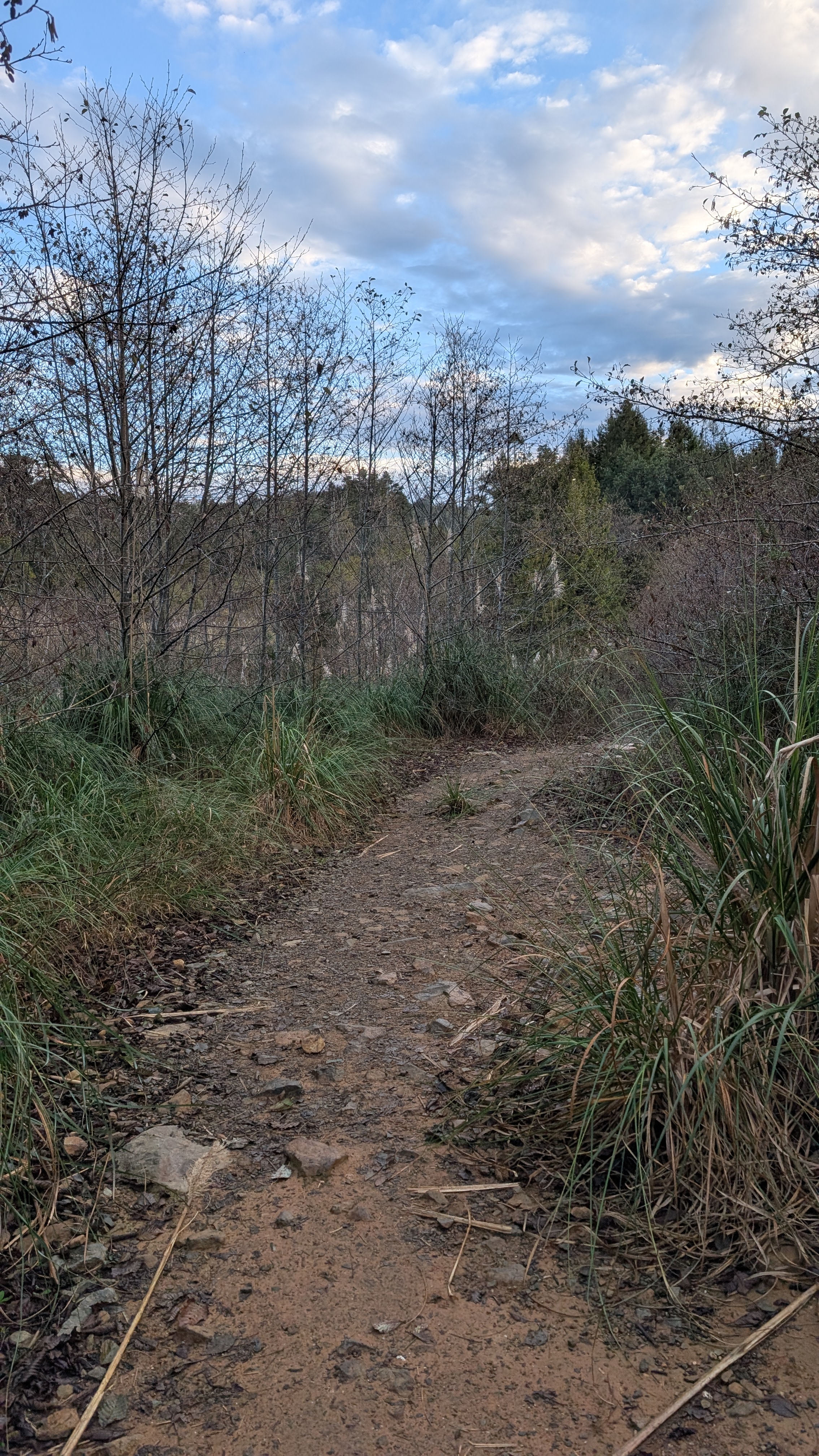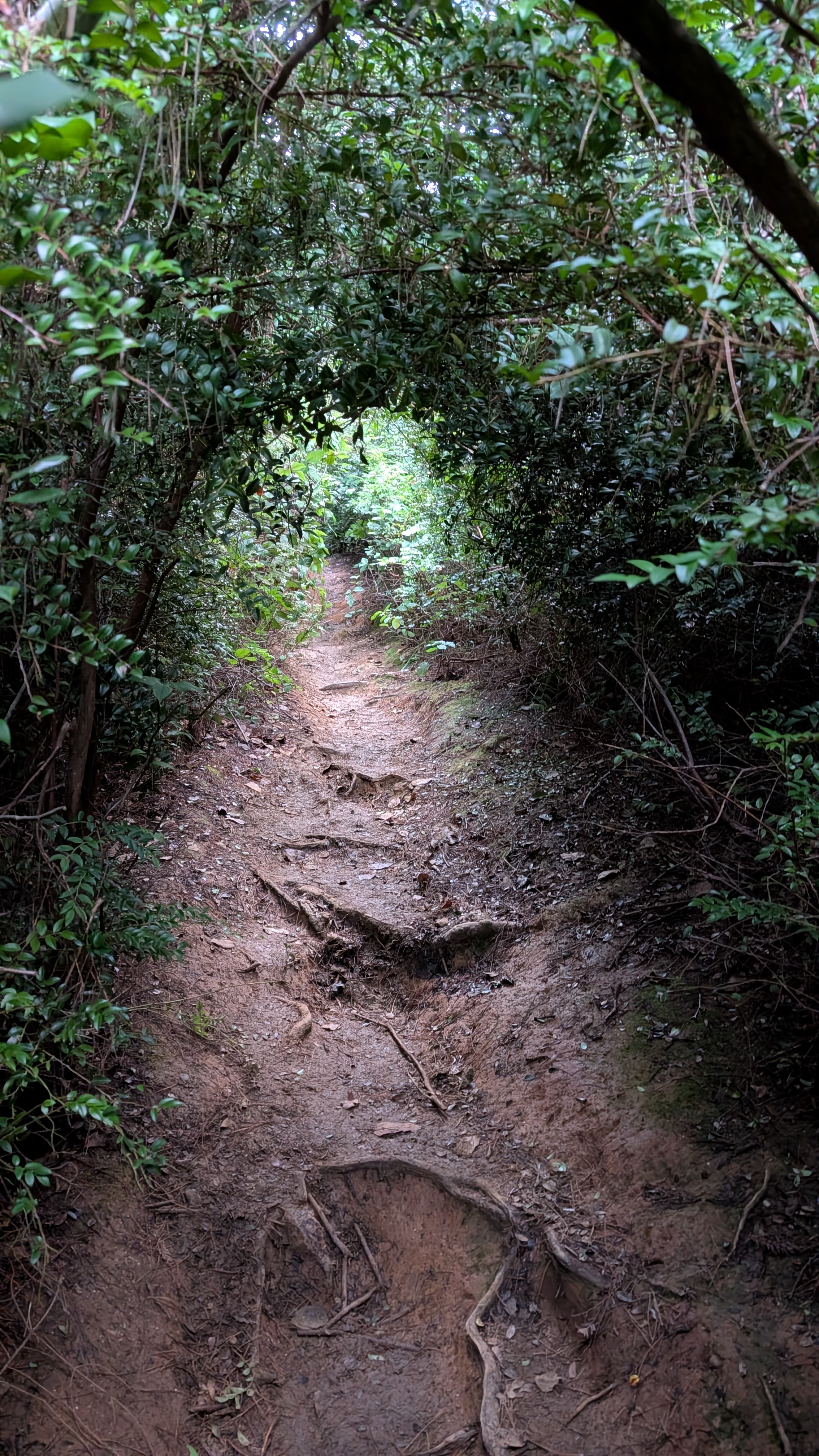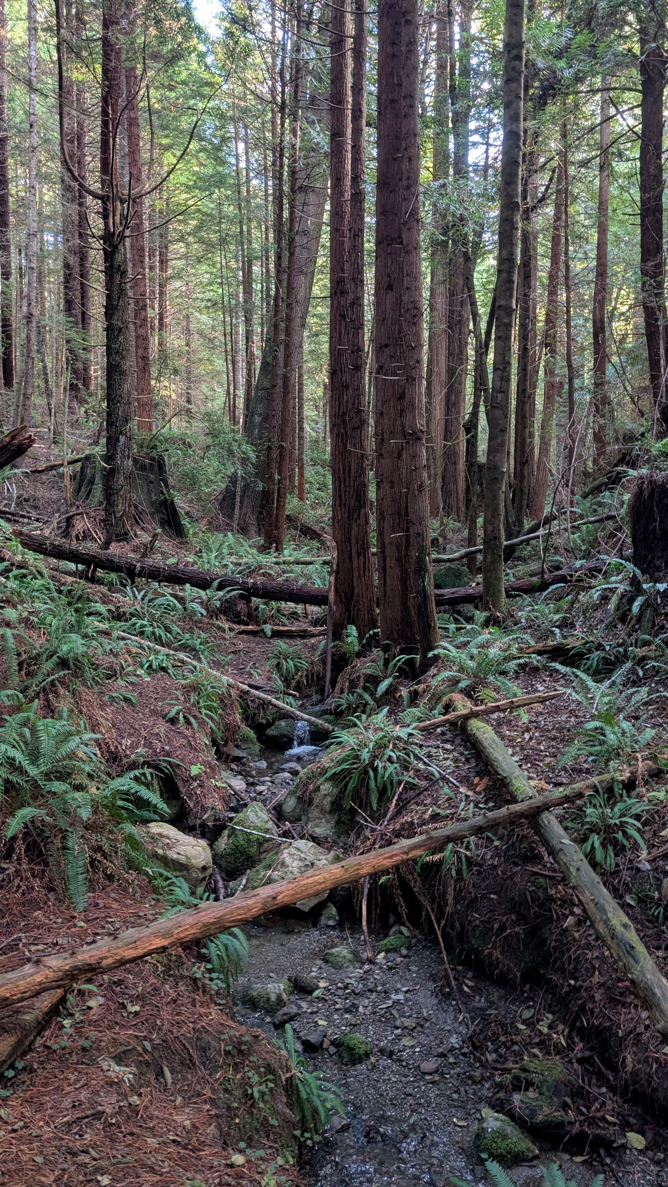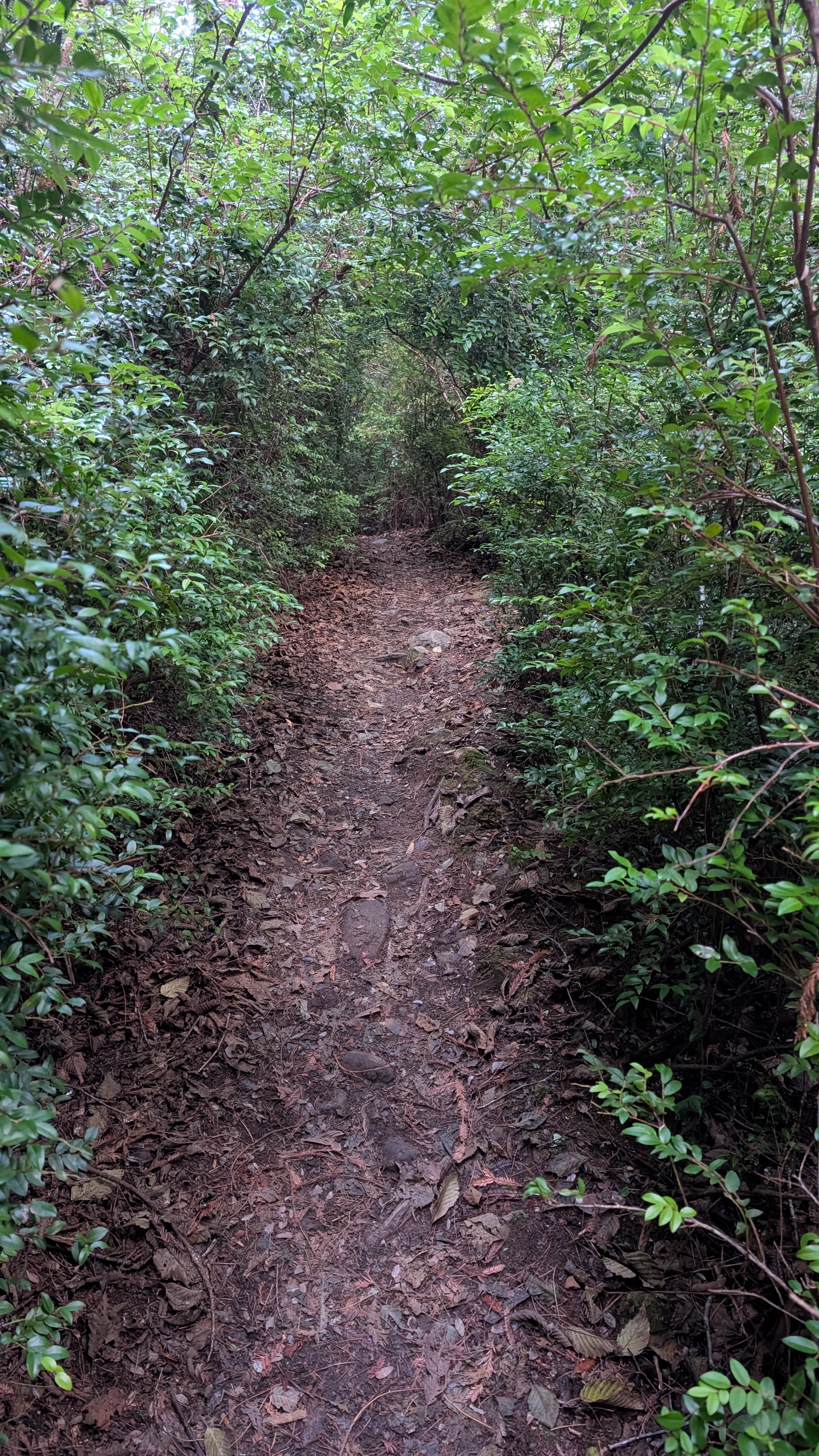 I can hear a wrentit calling from the direction of the flowing creek to my right. As I get closer to the ridge, the trail reduces to a tunnel. I hunch over and maneuver through the segments that periodically open up enough that I can stand upright. The climbing feels good and I push the pace to generate warmth on this cold morning.