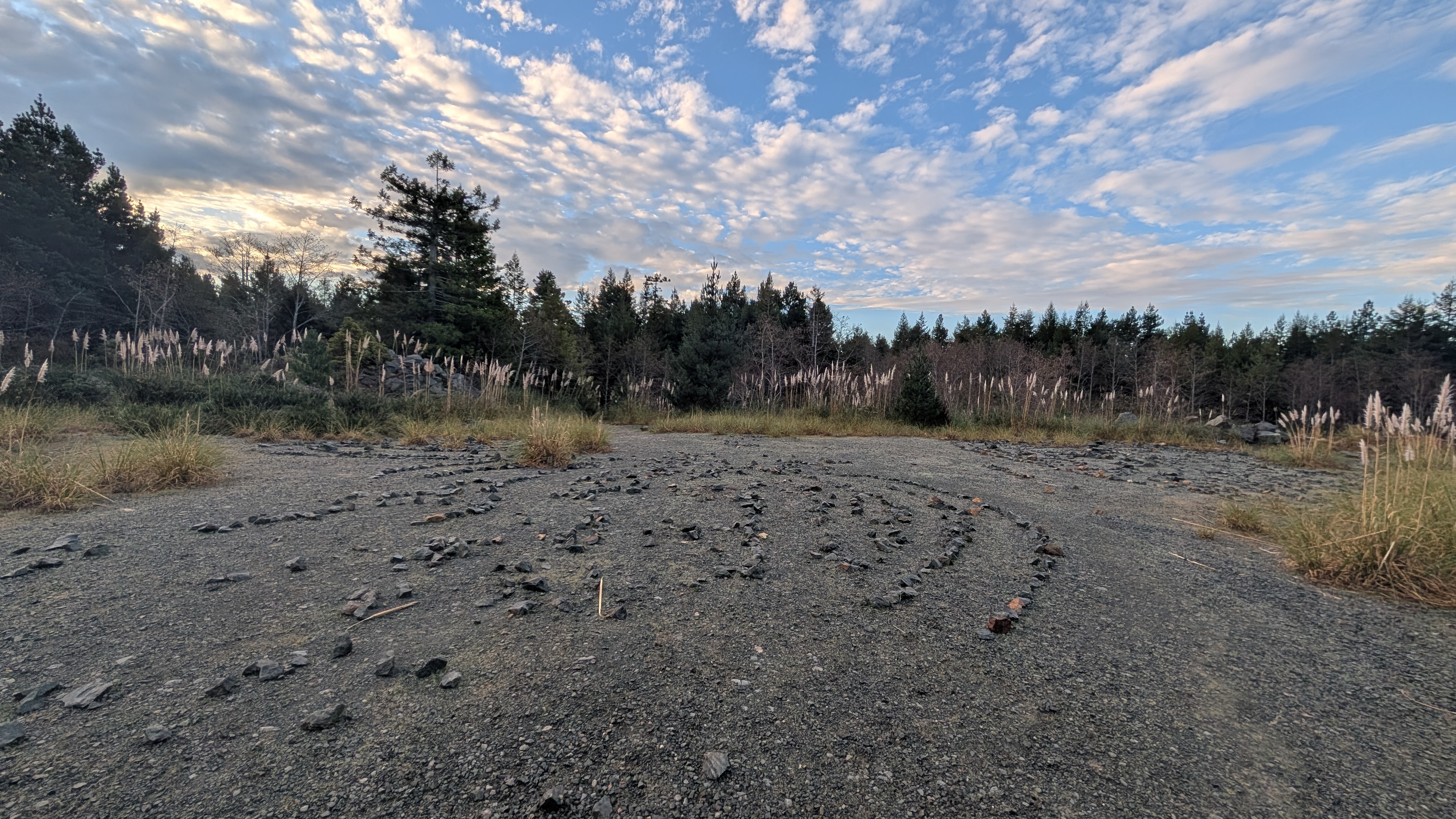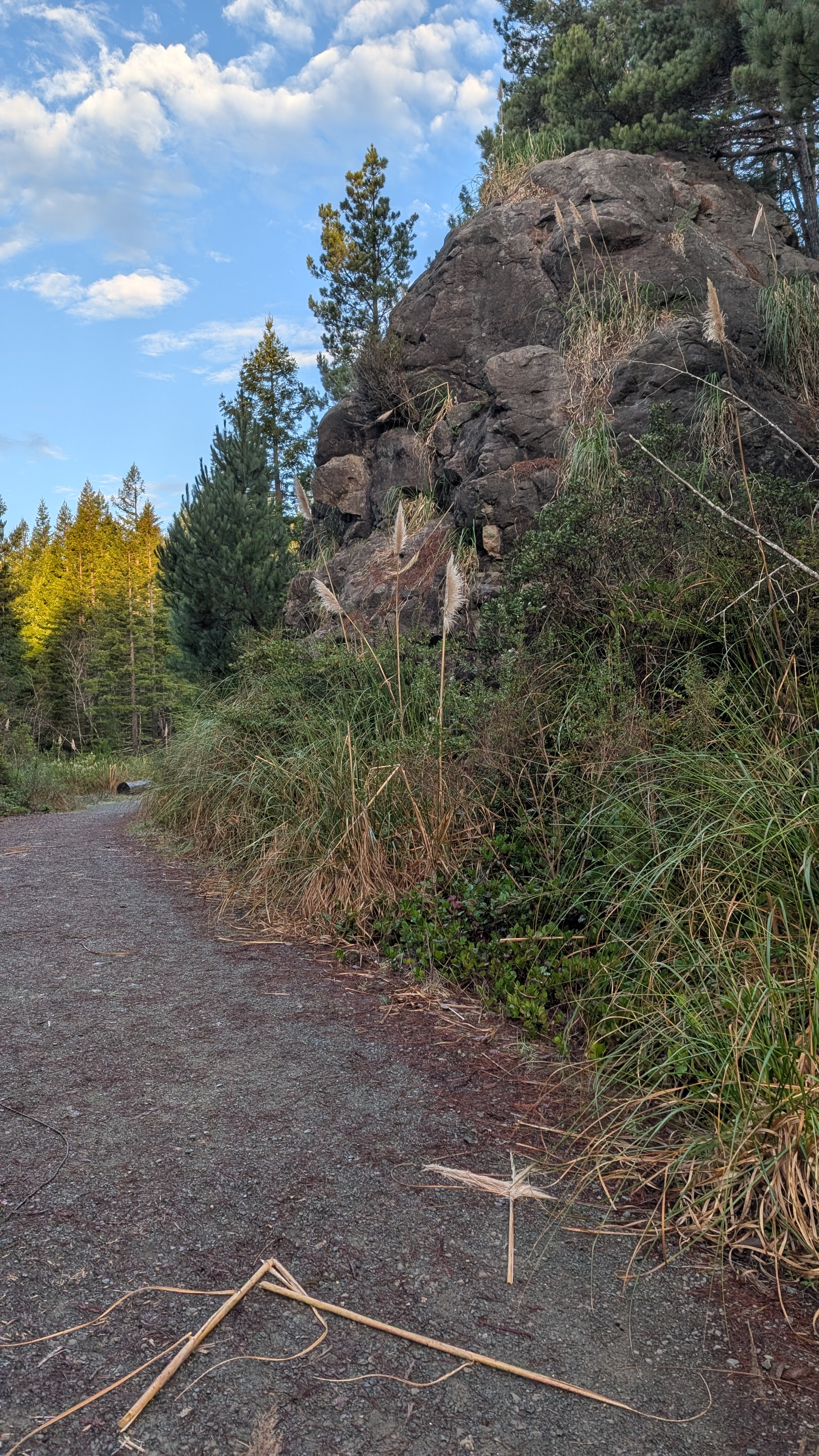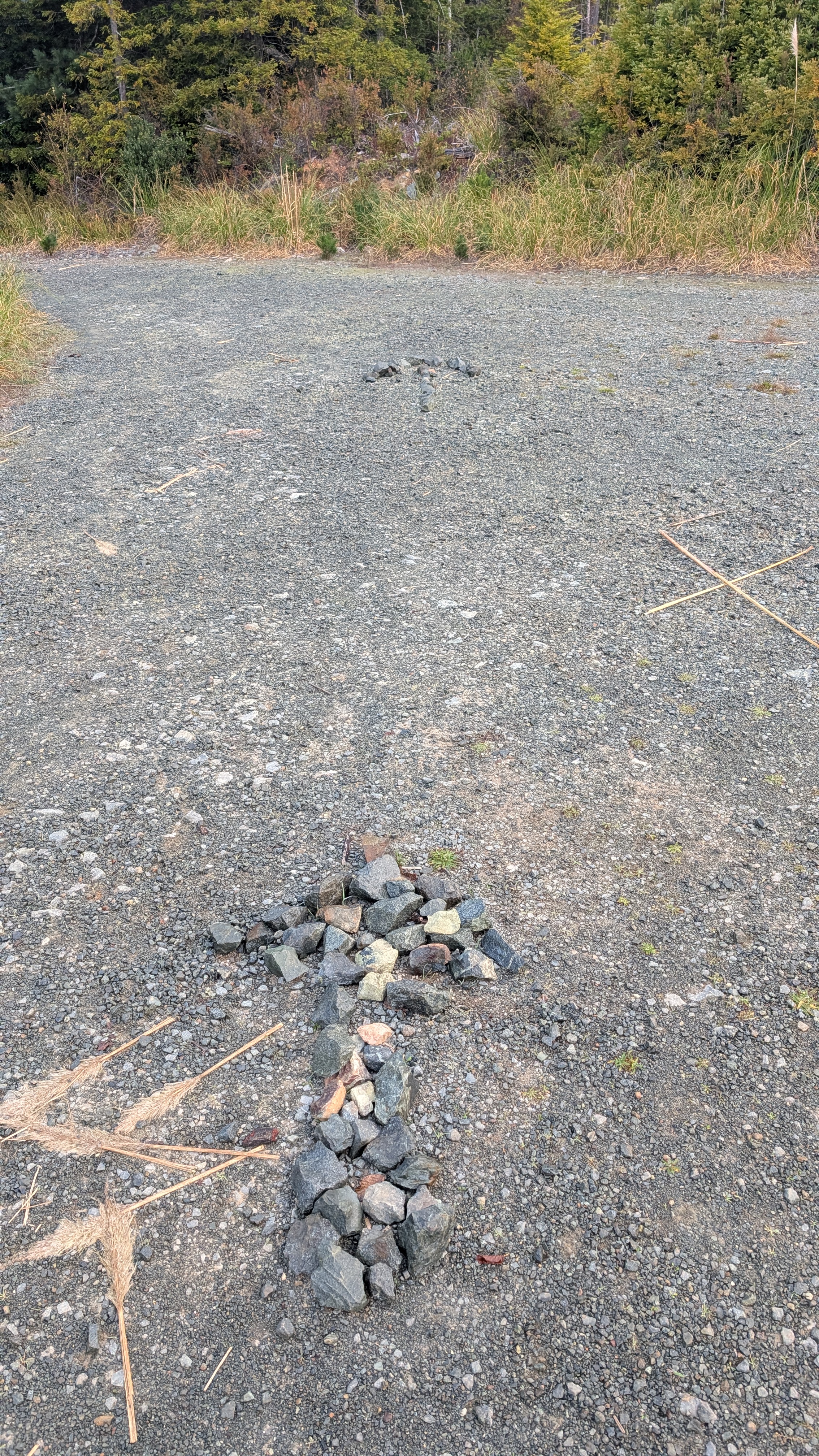 I emerge into blue skies and pampas grass-filled logging scars. I pass a large outcrop of rocks before connecting to a network of roads. I see that the peoples have been out placing rocks in ceremonial-like circles.