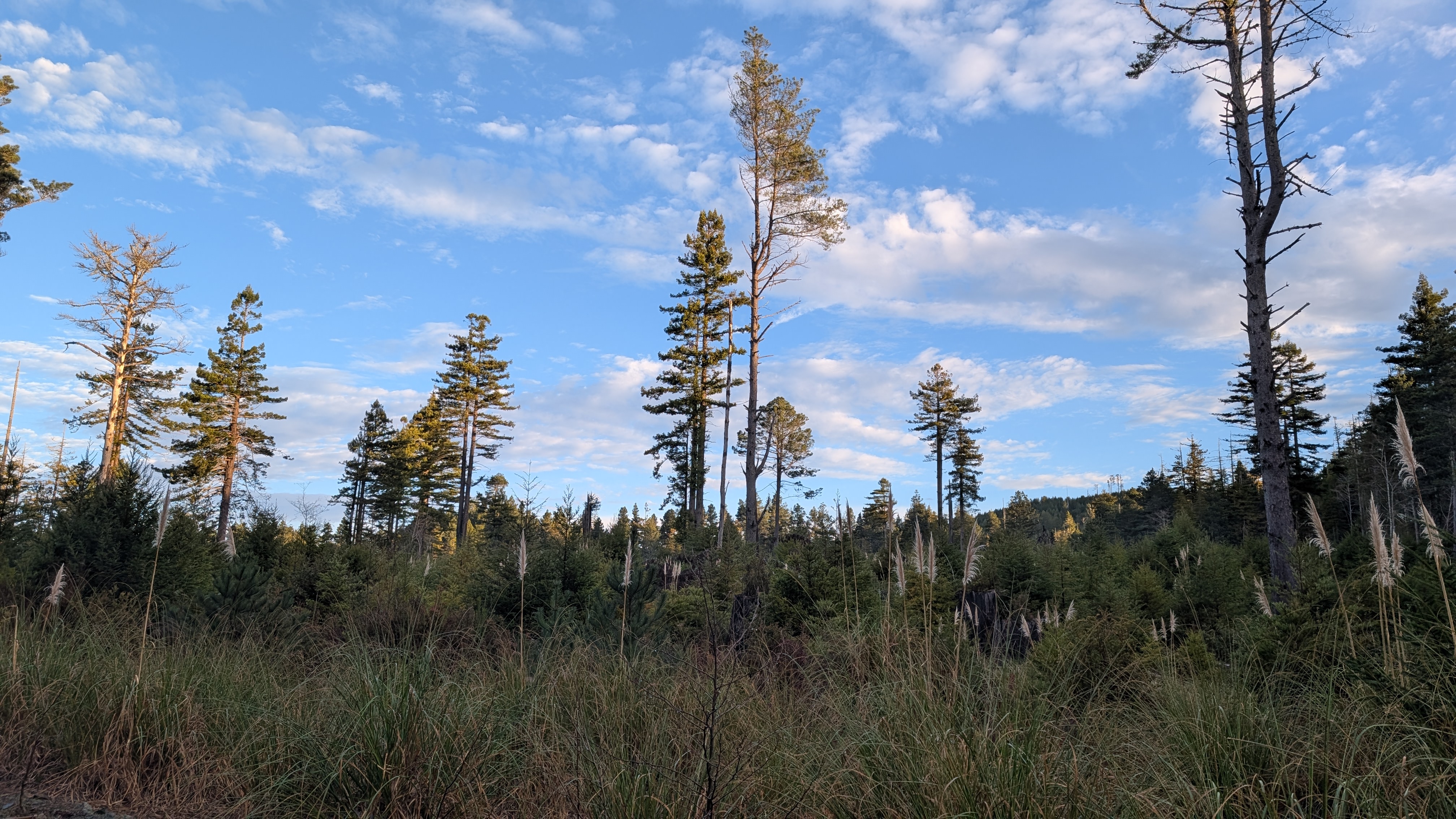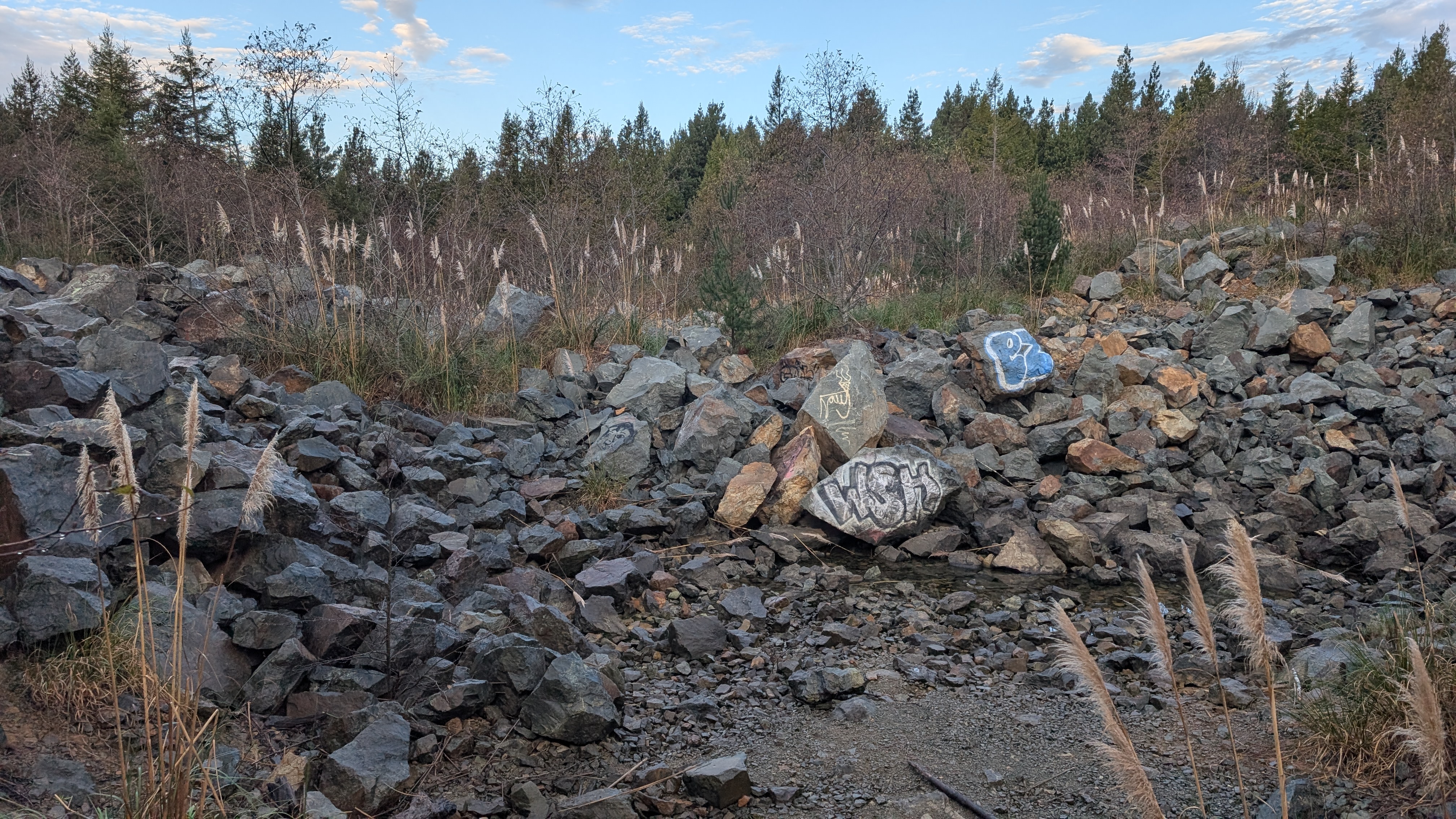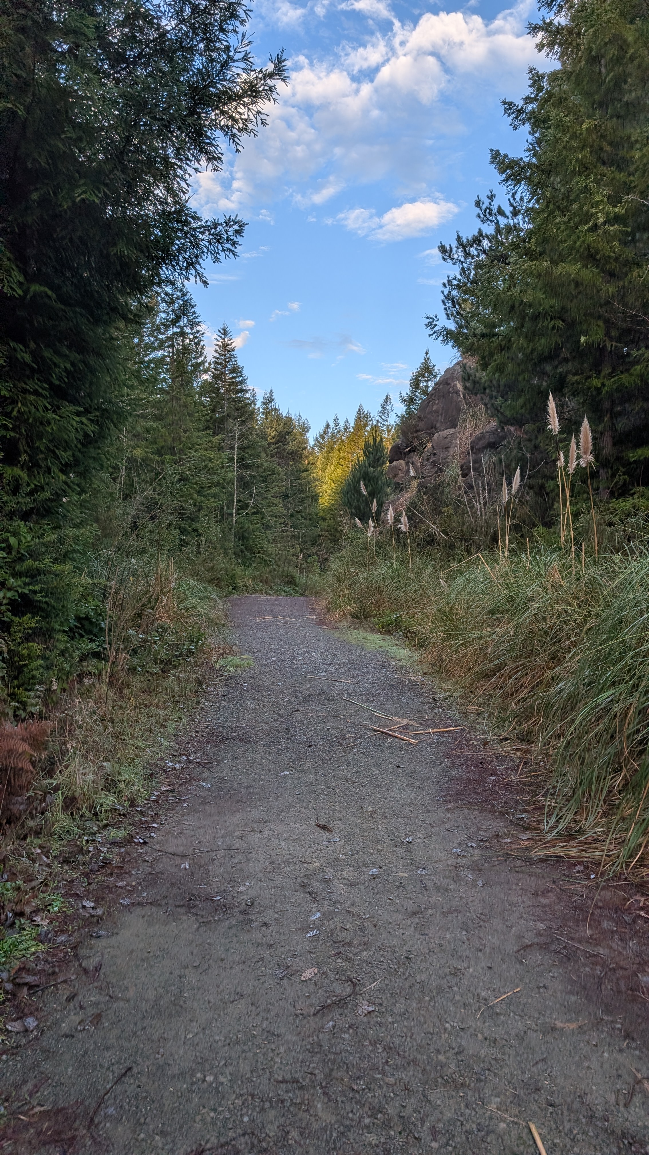 I emerge into blue skies and pampas grass-filled logging scars. I pass a large outcrop of rocks before connecting to a network of roads. I see that the peoples have been out placing rocks in ceremonial-like circles.
