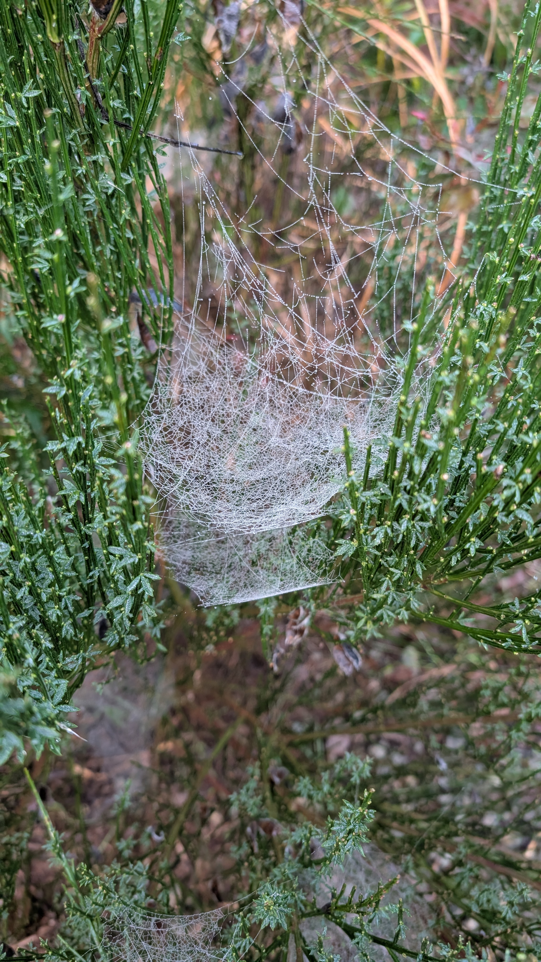 I follow the arrows and fork to the left. I pass dew-filled spider webs and a giant sea stack, baby strawberry rock.