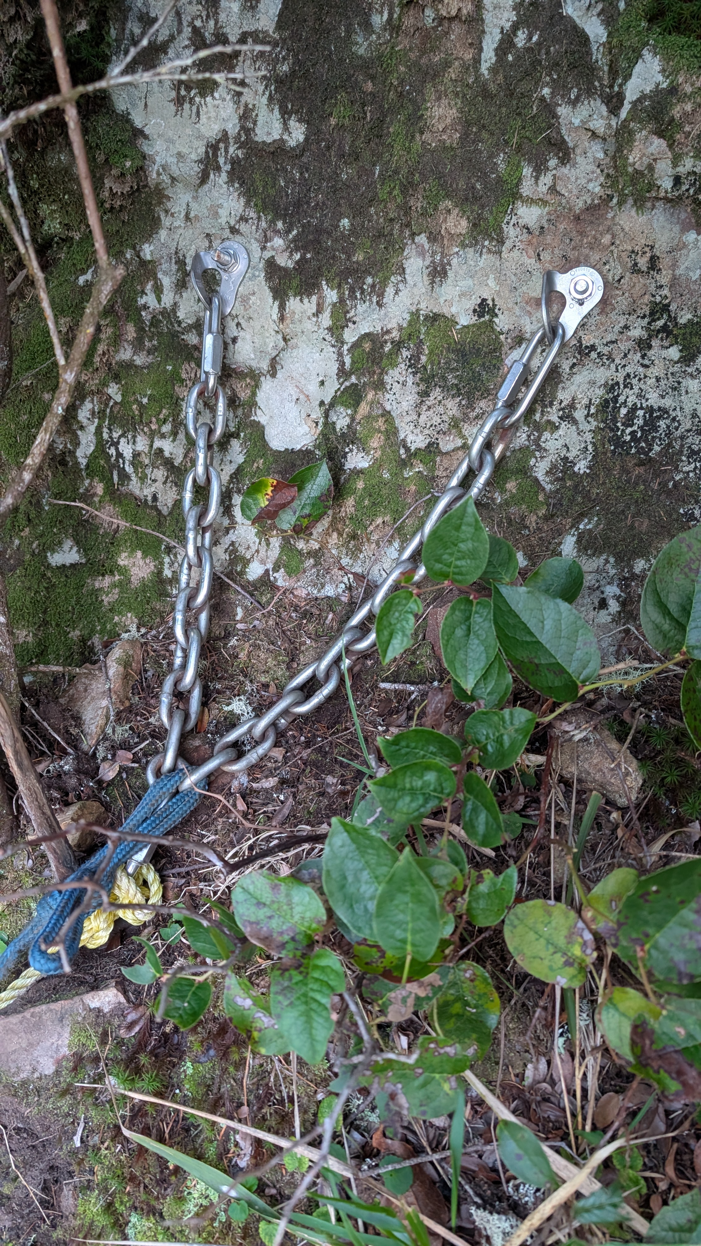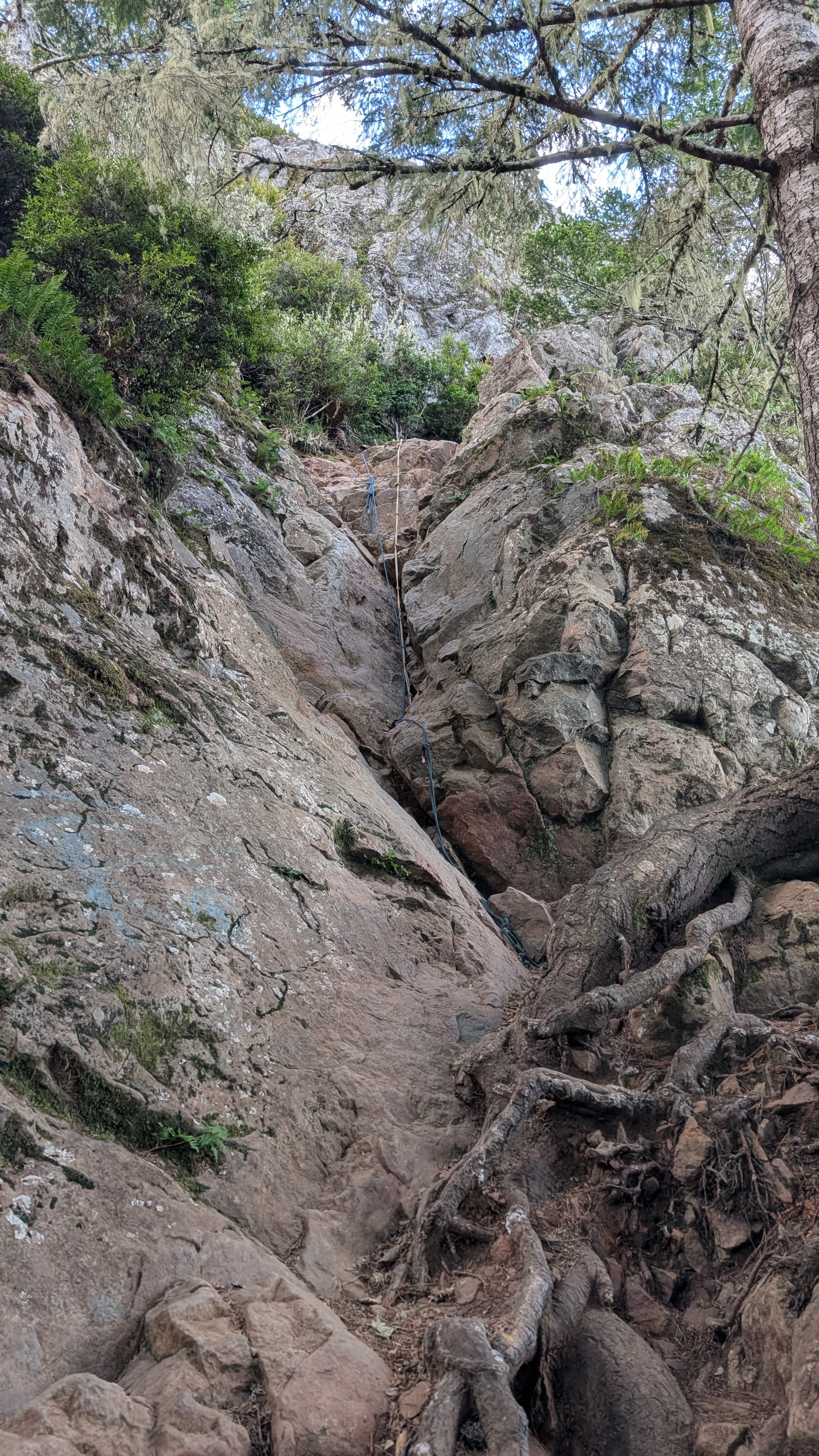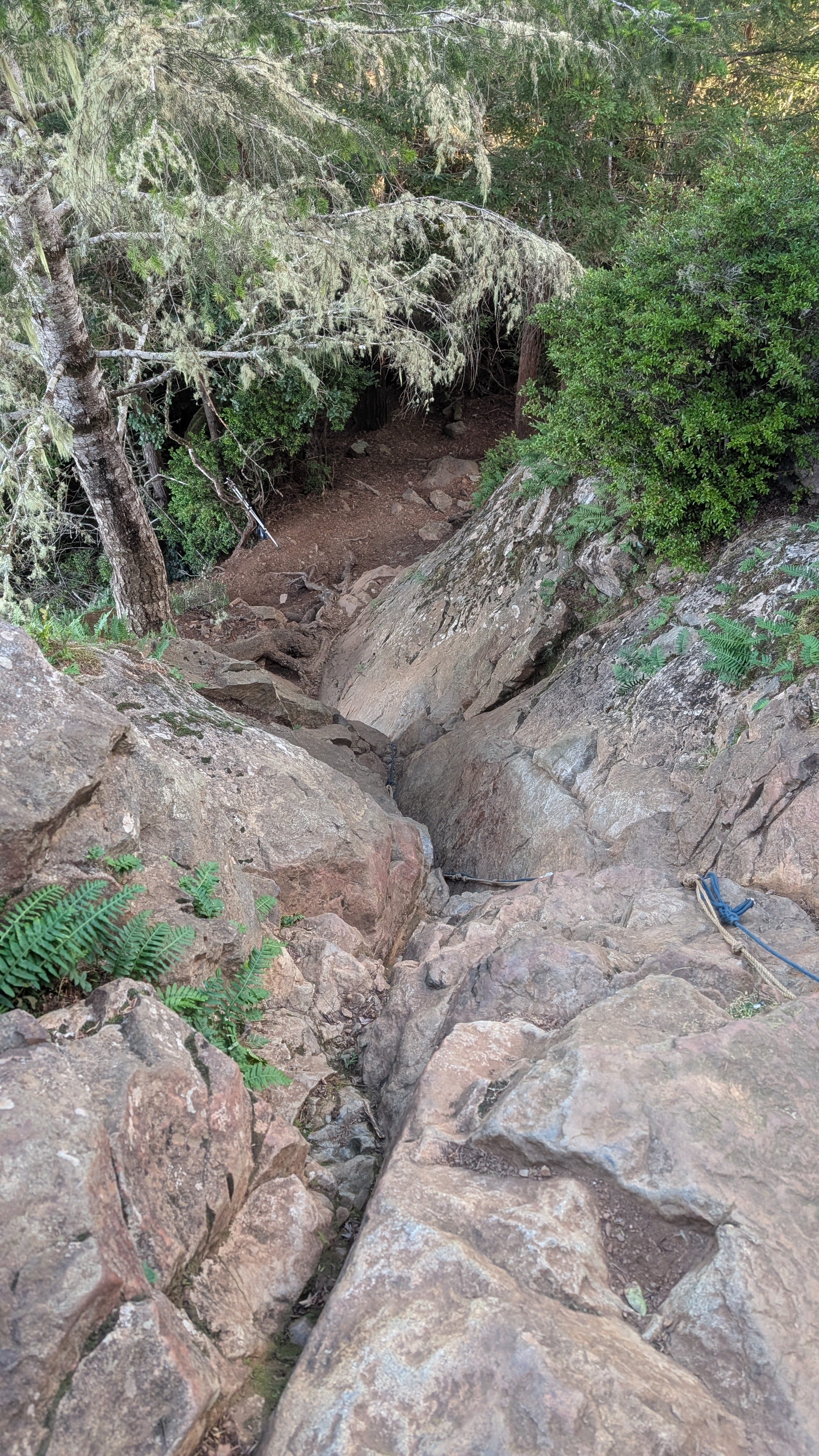 I decide to head back to the fork in the trail and see what heads off to the left. It is short lived as I circle to the East side of the rock. I scramble around the rock’s edge and end up back where I had just been with the ropes. I drop my poles and fanny pack. Ok, ropes it is. They’re mostly not needed on the way up but I can see that they will be helpful on the way back down. I give them a strong tug to test their viability.