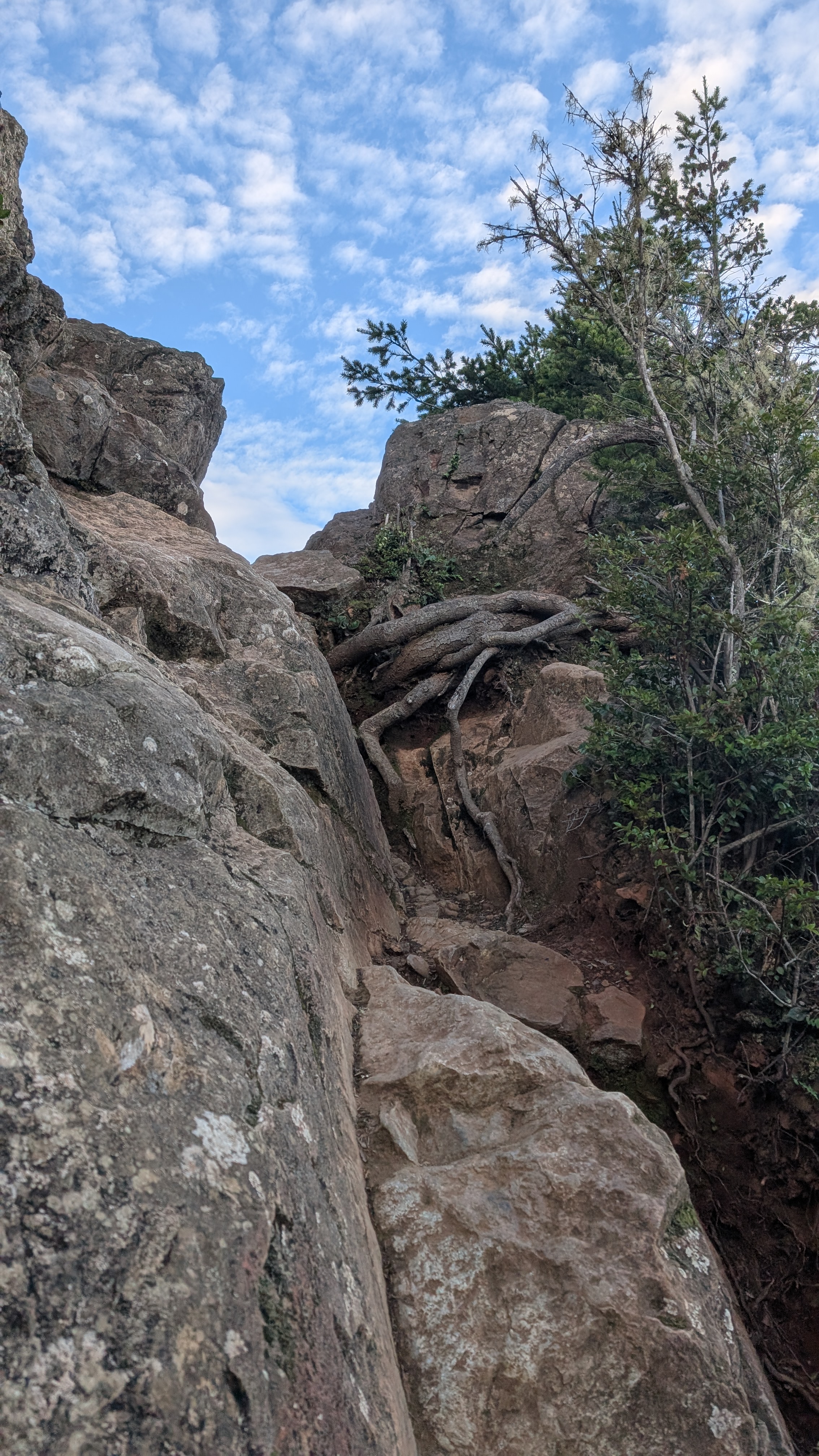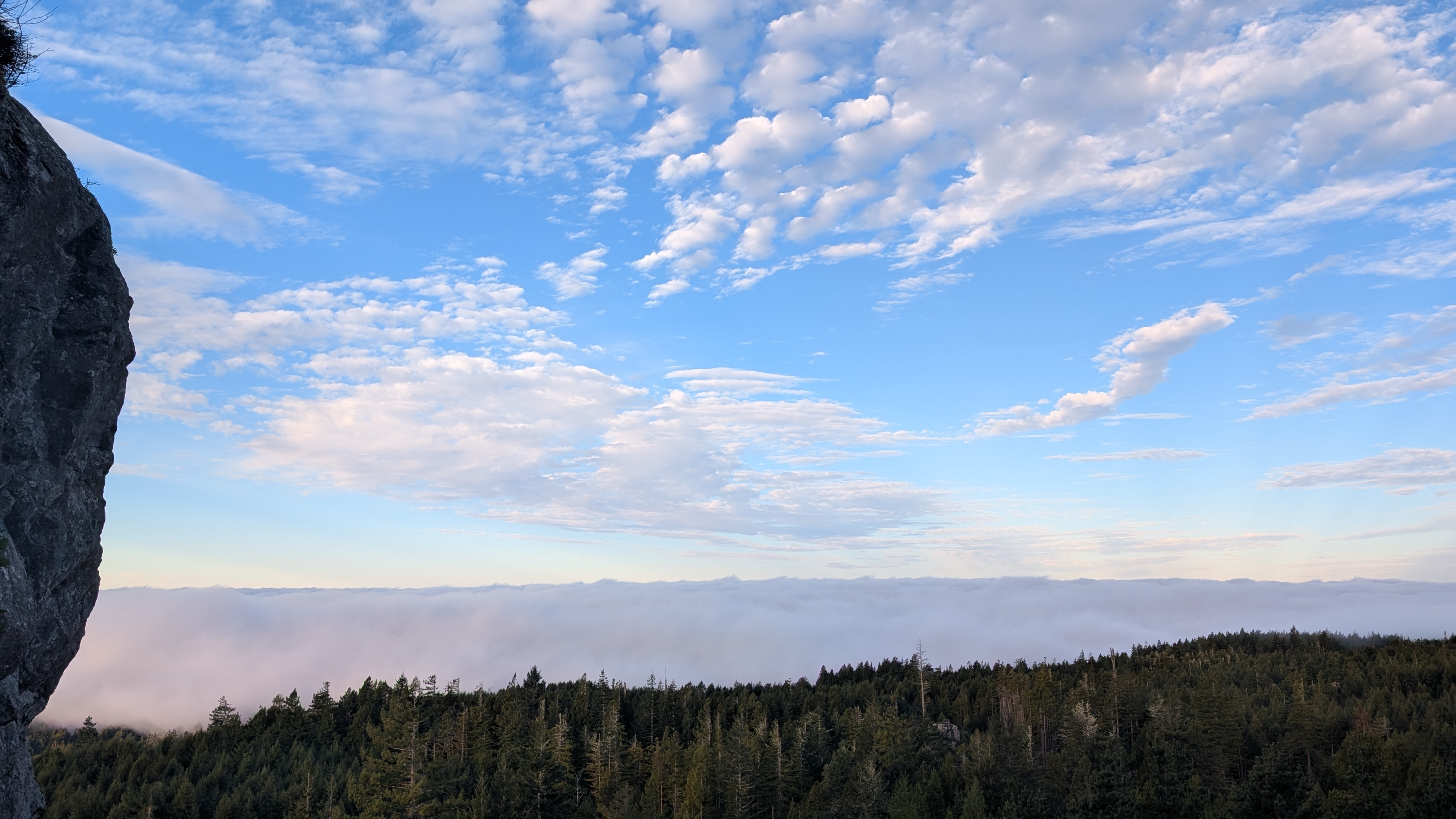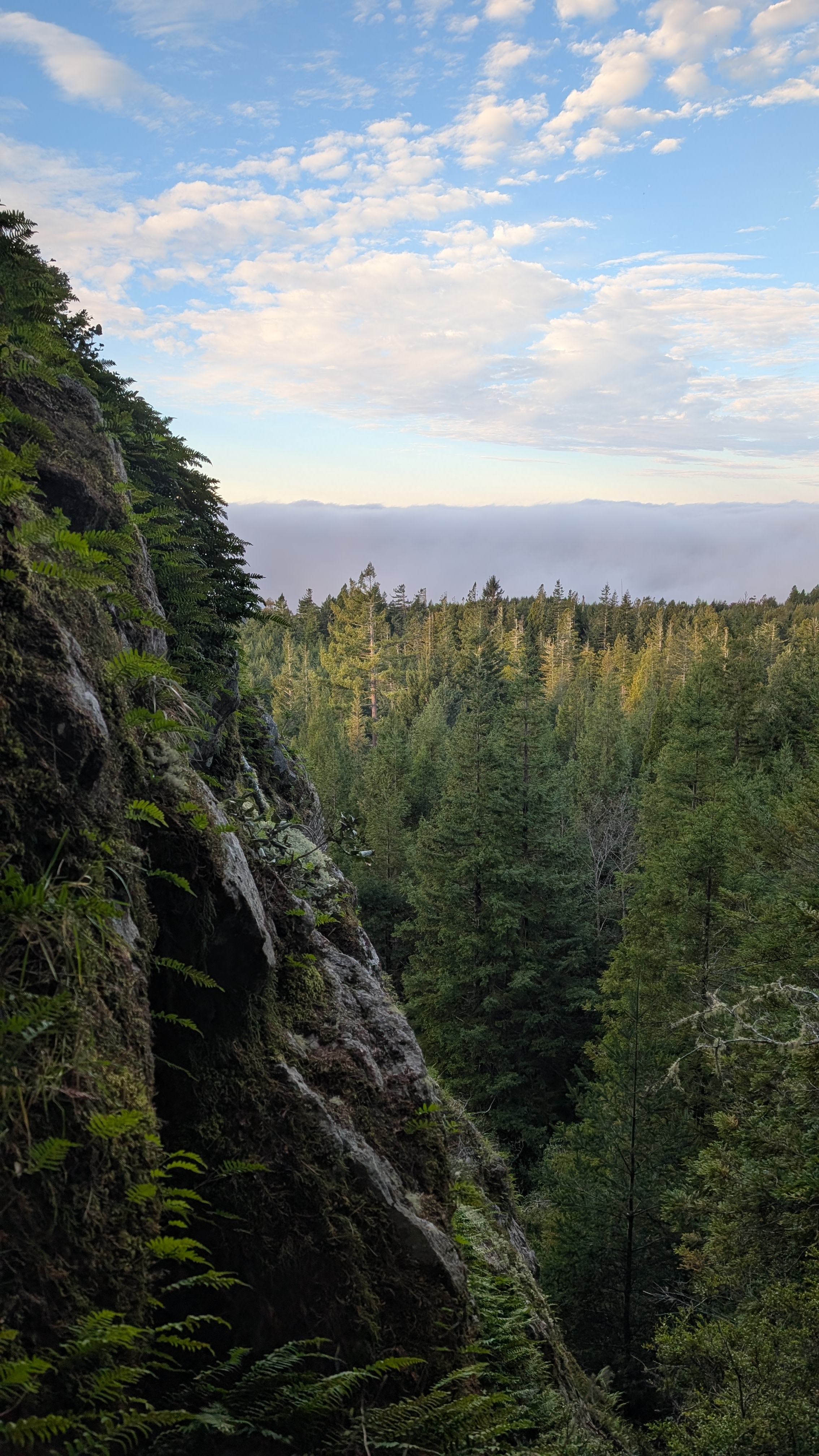 I climb up the rock face fairly easily by wedging my foot in the crack. I get up to where the ropes are bolted into the rock and then climb the next little section. It’s about 8:20 am and the sun is putting a golden glow across the sky. The thick fog bank is holding firm along the coast line.