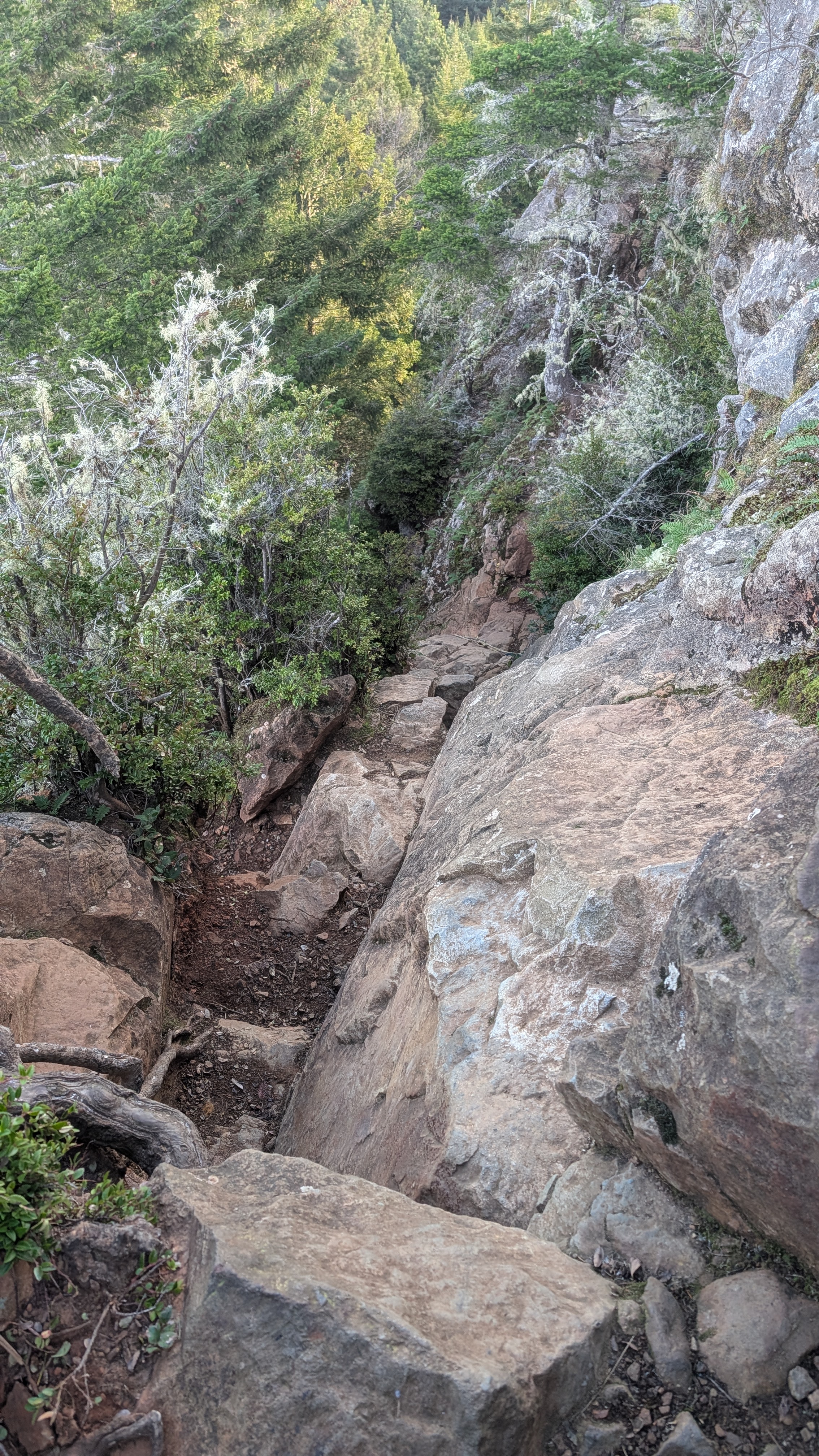 I climb one last section of rock to get to the very top at 835 feet. I’m treated to a spectacular view in all directions. But I’ll have to come back again when I can look out on the ocean. I spend about 20 minutes atop Strawberry Rock before deciding that it’s time to see if I can get down.