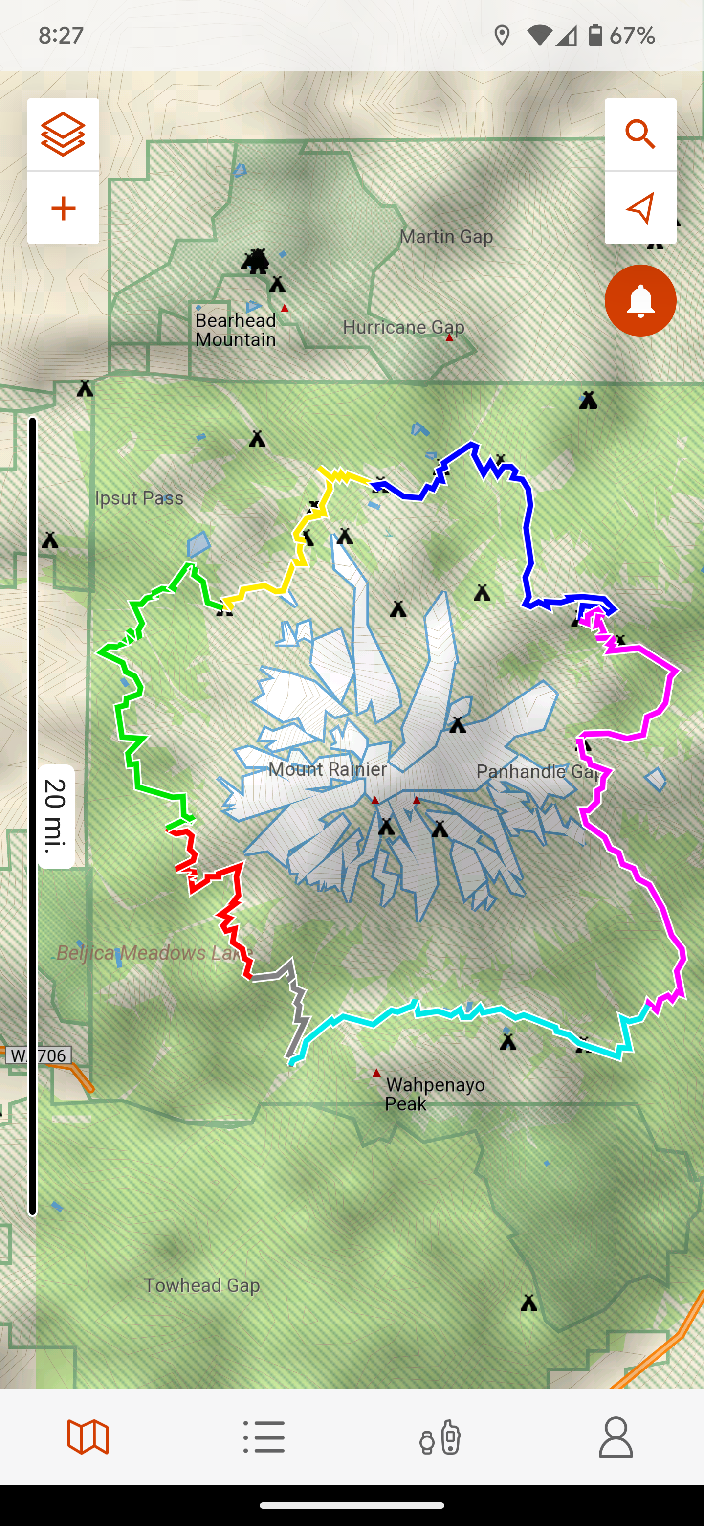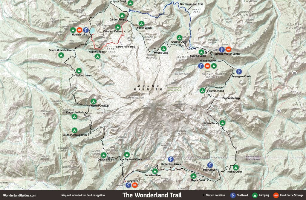 The Wonderland Trail is an approximately 93-mile trail circumnavigating Washington’s highest peak, Mt. Rainier. The land that is now Mt. Rainier National Park is the ancestral lands of the Nisqually, Puyallup, Squaxin Island, Muckleshoot, Yakima, Coast Salish and Cowlitz Tribes. The peak we know as Mt. Rainier is known as Tahoma or Talol by local tribes, who have lived on and cared for this land for at least the last 9,000 years. Tahoma means “mother of waters.”